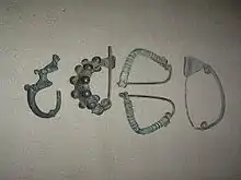 The classic fibula of the late-Roman era, and in fact the best known of all fibula types, is the crossbow type.[4][5] The crossbow fibula consists of a highly arched semi-circular bow, usually of squarish cross-section, and a long flat foot. The fibula has a wide transverse bar (or arms) at the head containing the pin-hinge. Crossbow fibulae usually have three round or onion-shaped knobs: one at the head and one at each end of the transverse bar.