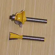 Two typical router bits: (top) a 14-inch shaft Roman Ogee with bearing, (bottom) 14-inch shaft dovetail bit.