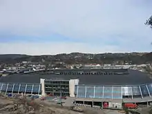 The stadium has a capacity for 14,563 spectators,[14] of which 1,400 are club seating.[19] However, the seating is artificially reduced to 11,700.[24] Built into the stadium is 22,000 square meters (240,000 sq ft) of commercial property.[3] The venue has many architectural similarities with Aker Stadion, home of Molde FK, which was also designed by Kosberg.[32] During one winter, the pitch was accidentally converted to a bandy field, when it was covered with a layer of ice up to 10 centimeters (4 in) thick because of cold weather.[33]