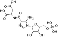 Phosphoribosylaminoimidazolesuccinocarboxamide (SAICAR) is an intermediate in the formation of purines. The conversion of ATP, L-aspartate, and 5-aminoimidazole-4-carboxyribonucleotide (CAIR) to 5-aminoimidazole-4-(N-succinylcarboxamide) ribonucleotide, ADP, and phosphate by phosphoribosylaminoimidazolesuccinocarboxamide synthetase (SAICAR synthetase) represents the eighth step of de novo purine nucleotide biosynthesis.[1]
