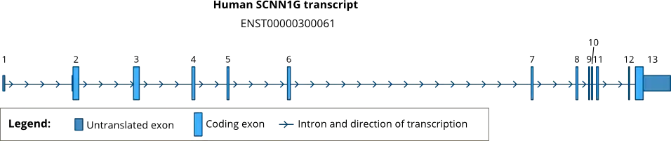 While the human gene SCNN1A is located in chromosome 12p,[12] the human genes encoding SCNN1B and SCNN1G are located in juxtoposition in the short arm of chromosome 16 (16p12-p13).[10] The structures of the human and rat SCNN1G genes were first reported by Thomas et al.[13][14] Later studies by Saxena et al. reported the complete coding sequence of the human SCNN1G gene establishing that it has 13 exons [11] The positions of introns are conserved in all three human ENaC genes, SCNN1A, SCNN1B and SCNN1G.[15] The positions of the introns are also highly conserved across vertebrates See: Ensembl GeneTree.