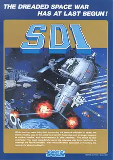 SDI - Strategic Defense Initiative, or simply titled SDI and sometimes known as Global Defense, is a 1987 horizontally scrolling shooter produced and released internationally in arcades by Sega. It was later ported to home computers and game consoles, some by other companies. Players control a satellite and must destroy enemies by moving a crosshair over them and firing the satellite's weapons.