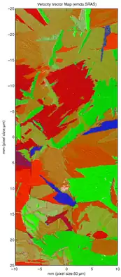 An acoustic slowness surface can be determined for each pixel by propagating the acoustic wave in several directions. Having measured the SAW velocity in multiple directions the challenge is then to convert this information into the measurement of crystallographic orientation. The direct calculation of the orientation from velocity is a difficult problem. However, the numerical calculation of the SAW velocity as a function of SAW velocity is relatively simple, as first outlined by Farnell. Therefore, a database of possible slowness surfaces can be pre-calculated and compared to the measurement values. For each measurement pixel the orientation is given by the orientation of the pre-calculated velocity surface which best matches the measured data. These maps can spatially describe the crystal orientation of the material being interrogated and can be used to examine microtexture and sample morphology. The technique is applicable to any crystal structure, however transverse isotropy means the full orientation cannot be determined in hexagonal materials, such as titanium.[2]