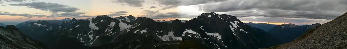 Panoramic view from the top of Sahale Arm at sunset. Summits include Bonanaza Peak, Mount Formidable, The Triplets, and Cascade Peak.