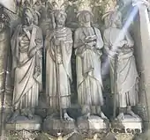 Many of the figures relate to Christian iconography, and echo those in the tympanum, including, in the ambulatory a window showing God as the King of Heaven overlooking the evangelists Matthew, Mark, Luke and John. In the panel, Matthew takes human form, Mark is depicted as a lion, Luke as an ox, while John takes the form of an eagle.[52] As elsewhere in the cathedral, the illustrations can be divided between the divine, wise and foolish.[57]