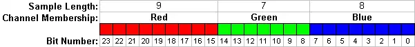 In this particular diagram, the Red sample occupies 9 bits, the Green sample occupies 7 bits and the Blue sample occupies 8 bits, totaling 24 bits per pixel. Note that the samples do not have to be equal size and not all samples are mandatory in a pixel.