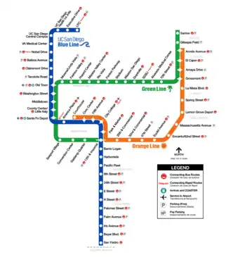 The San Diego Trolley system has 62 operational stations serving its four Trolley lines.[8][9]