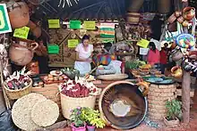 The community is best known for the preparation of mole, a traditional sauce that comes in a variety of flavors. Modern mole is derived from a pre-Hispanic preparation called "chilmulli," which in Nahuatl means "chili pepper sauce" During the colonial period, this sauce was modified mostly by adding ingredients such as nuts, peanuts, sesame seeds and spices such as cinnamon. While the flavors have multiplied and changed, the consistency of the sauce has remained the same.[1] Almost 92% of the community's population makes a living related to the preparation and sale of the sauce.[1] The moles of San Pedro Atocpan are not made in factories but rather in small family-owned enterprises.[6] Moles of different flavors, aromas, colors and textures are made, but the specialty is "mole almendrado" (almond mole), which was invented here and made with between 26 and 28 ingredients, always with a base of three chili peppers: mulato, pasilla and ancho. The recipe is well-guarded.[7] Many of these small businesses have networked to find ways to buy the more than twenty ingredients most moles need, such as chili peppers from Zacatecas, eliminating the need for middlemen. Each family in the town has its own recipes for the various types of moles. The family of Guadalupe Rios, for example, adds apple to her moles, presumably to avoid digestive problems.[1]