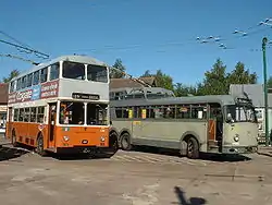 In addition to trolleybuses, 14 diesel buses are located at the museum, some of which are used to give tours around the locality on open days.[20] The collection also includes some service vehicles, including four tower wagons, which were used to maintain the overhead wiring, the oldest of which dates from 1903 and was horse-drawn. Other ancillary vehicles include a pole crane, a Smith Electric Vehicles parcel van, three tractors and the lower saloons of two trams.[21]
