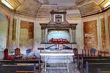 The usual highlight of Good Friday is the Santo Entierro ("Holy Burial"), which is both the name of the rite itself and of the statue of the dead Christ that is its focus.[18] Comparable to the Eastern Orthodox and Eastern Catholic practice of processing the epitaphios, the sculpted image of the Santo Entierro. Left bare or covered to the neck in a shroud of red, white, black, or gold, the image is laid in an ornate, flower-decked calandra or bier that is brought around in a funeral procession.[18] The retinue is normally composed of images of saints connected to the Passion narrative, such as Peter, Mary Magdalene, and John the Evangelist. Tradition dictates that regardless of the number of images used in the procession, that of the Virgin Mary, dressed in black and gold as the mourning Mater Dolorosa, is always last and alone as a mark of importance.