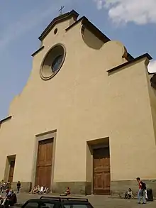 The land for the Augustinian church and convent was donated by Speziale and Acolti to Aldebrandino, a prior of the Augustinian establishment in Arcetri in 1250.[1] The plot was located on the south bank of Arno in the sesto (one of the six sestieri of Florence) Oltrarno, within the communal walls of 1173–1175,[2] but in a sparsely populated area. It became more accessible with construction of the Holy Trinity bridge (Ponte Santa Trinita) in 1252. The Augustinians started the church and the convent in the same year,[3] incorporating an old church of San Romolo in the complex.[1] It was originally dedicated to Mary, All Saints and the Holy Spirit, changing by the end of the century to Mary, the Holy Spirit and Matthew.[4]
