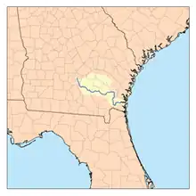 The Satilla River rises in Ben Hill County, Georgia, United States, near the town of Fitzgerald, and flows in a mostly easterly direction to the Atlantic Ocean. Along its approximately 235-mile (378 km)[1] course are the cities of Waycross, Waynesville, and Woodbine. The Satilla drains almost 4,000 square miles (10,000 km2) of land, all of it in the coastal plain of southeastern Georgia. It has white sandbars and is the largest blackwater river situated entirely within Georgia.[2][3] The Satilla enters the Atlantic Ocean about 10 miles (16 km) south of Brunswick, at the 31st parallel north. Satilla River Marsh Island[4] The river derives its name from a Spanish officer named Saint Illa, and over time the name was corrupted to form the word Satilla. French explorer Jean Ribault named the river the Somme when he encountered it in 1562. The river was later given the name Aisne by Jacques le Moyne.[5]