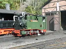It was driven the first few meters under its own steam on 16 June 2009 in Meiningen. On 4 July 2009, the new locomotive was christened and officially put into service in the narrow-gauge area of Radebeul Ost station.[1] The new locomotive 54, which also bears the computer number 99 7528, was initially at home on the Preßnitztalbahn in Jöhstadt. On 30 August 2009, the locomotive was first used as scheduled in front of the museum trains between Jöhstadt and Steinbach. After the dissolution of the Association for the Promotion of Saxon Narrow Gauge Railways, the Saxon Narrow Gauge Railways Foundation (Stiftung Sächsische Schmalspurbahnen) has owned the locomotive since 2015 and has housed it with the Saxon-Upper Lusatian Railway Company (SOEG) from summer 2015. This does not change anything in the previous operating concept.[2]