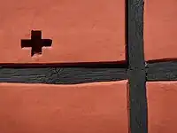 The western gable is extended with a one-storey barn, also in timber framing but with dressed fillings and cross-shaped ventilation holes towards the street. To the north, there is a one-bay, two-storey extension, dating from 1857, also in timber framing, where the current main entrance is found.