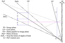 When the lens and image planes are parallel, the depth of field (DoF) extends between parallel planes on either side of the plane of focus. When the Scheimpflug principle is employed, the DoF becomes wedge shaped (Merklinger 1996, 32; Tillmanns 1997, 71),[lower-alpha 6] with the apex of the wedge at the PoF rotation axis,[lower-alpha 7] as shown in Figure 5. The DoF is zero at the apex, remains shallow at the edge of the lens's field of view, and increases with distance from the camera. The shallow DoF near the camera requires the PoF to be positioned carefully if near objects are to be rendered sharply.