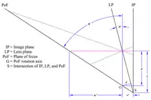 When the lens and image planes are not parallel, adjusting focus[lower-alpha 1] rotates the PoF rather than merely displacing it along the lens axis. The axis of rotation is the intersection of the lens's front focal plane and a plane through the center of the lens parallel to the image plane, as shown in Figure 3. As the image plane is moved from IP1 to IP2, the PoF rotates about the axis G from position PoF1 to position PoF2; the "Scheimpflug line" moves from position S1 to position S2. The axis of rotation has been given many different names: "counter axis" (Scheimpflug 1904), "hinge line" (Merklinger 1996), and "pivot point" (Wheeler).