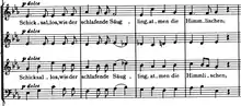The Schicksalslied (Song of Destiny), Op. 54, is an orchestrally accompanied choral setting of a poem written by Friedrich Hölderlin and is one of several major choral works written by Johannes Brahms. Brahms began the work in the summer of 1868 at Wilhelmshaven, but it was not completed until May 1871.[1] The delay was primarily due to Brahms's hesitation over how the piece should end. Hesitant to make a decision, he began work on the Alto Rhapsody, Op. 53, which was completed in 1869 and first performed in 1870.[2]
