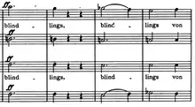 4 meter, is marked Allegro and opens with eight measures of eighth note motion in the strings. The orchestral eighth notes continue for 20 measures as the chorus enters in unison with Doch uns ist gegeben. The eighth notes intensify and climax at a ff in measure 132 as Brahms sets the lyric blindlings von einer Stunde zur andern to the chorus dividing into a B diminished seventh chord.