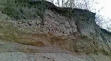 Most burrow nesting species dig a horizontal tunnel into a vertical (or nearly vertical) dirt cliff, with a chamber at the tunnel's end to house the eggs.[51] The length of the tunnel varies depending on the substrate and the species; sand martins make relatively short tunnels ranging from 50–90 cm (20–35 in),[52] for example, while those of the burrowing parakeet can extend for more than three meters (nearly 10 ft).[53] Some species, including the ground-nesting puffbirds, prefer flat or gently sloping land, digging their entrance tunnels into the ground at an angle.[54] In a more extreme example, the D'Arnaud's barbet digs a vertical tunnel shaft more than a meter (39 in) deep, with its nest chamber excavated off to the side at some height above the shaft's bottom; this arrangement helps to keep the nest from being flooded during heavy rain.[55] Buff-breasted paradise-kingfishers dig their nests into the compacted mud of active termite mounds, either on the ground or in trees.[49] Specific soil types may favour certain species and it is speculated that several species of bee-eater favor loess soils which are easy to penetrate.[56][57]