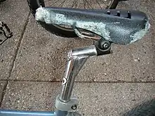 A bicycle seatpost,[1] seatpin,[2] saddlepole,[3] saddle pillar,[4] or saddle pin[5] is a tube that extends upwards from the bicycle frame to the saddle. The amount that it extends out of the frame can usually be adjusted, and there is usually a mark that indicates the minimum insertion (or maximum extension). Seatposts can be made of steel, aluminum, titanium, carbon fiber, or aluminum wrapped in carbon fiber.[6]
