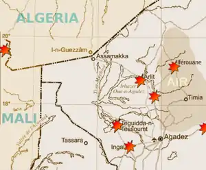 In March 2006, Malian army officer Hassan ag Fagaga, of Tuareg origins, defected from his post with a number of his men, also of Tuareg origins, On 17 May, an attack was launched on the Malian Army at Tin Zawaten, near the meeting of the Mali, Algerian, and Niger borders.[47] On 22 May 2006, a number of former Tuareg rebel, including Hassan ag Fagaga and Ibrahim ag Bahanga intensified their campaign with the simultaneous seizing of arms and material from the military bases in Menaka and Kidal, after which the assailants took to the former rebel bases from the 1990s in the Tigharghar mountains of the Kidal region.[48]