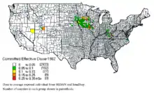 The explosion caused two plumes of radioactive cloud, rising to 3.0 km and 4.9 km (10,000 ft and 16,000 ft). The plumes headed northeast and then east in roughly parallel paths towards the Atlantic Ocean. Nuclear fallout was dropped through several counties.[3] Detected radioactivity was especially high in eight counties in Iowa and one county each in Nebraska, South Dakota and Illinois. The most heavily affected counties were Howard, Mitchell and Worth counties in Iowa as well as Washabaugh County in South Dakota. These four counties measured maximum levels higher than 6,000 microcuries per square meter (220 MBq/m2).[9]