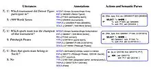 A standard dataset for question answering via semantic parsing is the Air Travel Information System (ATIS) dataset, which contains questions and commands about upcoming flights as well as corresponding SQL.[33] Another benchmark dataset is the GeoQuery dataset which contains questions about the geography of the U.S. paired with corresponding Prolog.[30] The Overnight dataset is used to test how well semantic parsers adapt across multiple domains; it contains natural language queries about 8 different domains paired with corresponding λ-DCS expressions.[42] Recently, semantic parsing is becoming so popular because of new research works and many large companies like Google, Microsoft, Amazon etc are working on this area. One on the resent work of Semantic Parsing for question answering is attached here.[43] In this picture it's a representation of an example conversations from SPICE. The left column shows dialogue turns (T1–T3) with user (U) and system (S) utterances. The middle column shows the annotations provided in CSQA. Blue boxes on the right show the sequence of actions (AS) and corresponding SPARQL semantic parses (SP).