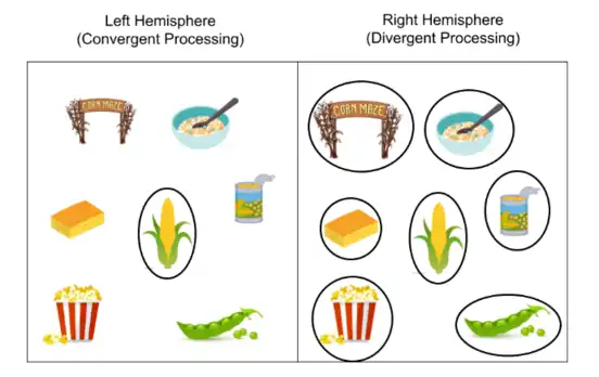 Above is an example of what differences in the Left and Right Hemispheres may look like during semantic processing. If one was told asked for the associations of the word "corn," the Left Hemisphere would most likely quickly prime the image circled above, a corn on the cob. The Right Hemisphere on the other hand, would prime both the corn on the cob, as well as other loosely associated words or meanings, like a corn maze, cornbread, popcorn, or even other starchy vegetables like peas. Though it works slower, the Right Hemisphere is able to activate a wider semantic network, and sustain it for longer than the Left Hemisphere.