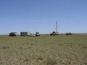 Kazakh steppe landscape and a drilling tower in the Semipalatinsk test site (2003)