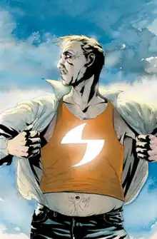The Sentry's powers ostensibly derive from the Super-Soldier Serum that "moves his molecules an instant ahead of the current timeline."[59][60] This was designed to be a hundred thousand times stronger than the original used on Captain America, and was modified by Weapon X.[61] However, in The Age of the Sentry miniseries, it is suggested that Sentry is a sentient life force, a refugee from another universe who attempted to break through to another one for its new home, and that this was merely accommodated by the serum.[62]