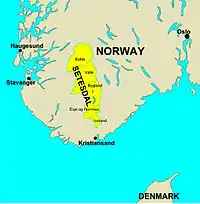 Setesdal (Urban East Norwegian: [ˈsêːtəsdɑːɫ];[1] older name: Sætersdal) is a valley and a traditional district in Agder County in southern Norway. It consists of the municipalities of Bykle, Valle, Bygland, Iveland, and Evje og Hornnes.