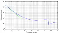 Defining a drag coefficient, , as the ratio of the force experienced by the particle divided by the impact pressure of the fluid, a coefficient that can be considered as the transfer of available fluid force into drag is established. In this region the inertia of the impacting fluid is responsible for the majority of force transfer to the particle.