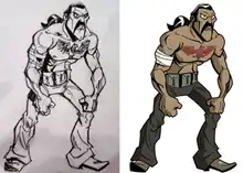 Development for Shank began in January 2009.[3] The idea for the game was created by Jeff Agala and Klei Entertainment CEO Jamie Cheng.[3] Cheng described it as an "ode to Double Dragon with a Tarantino film feel to it."[7] The story was written by God of War co-creator Marianne Krawczyk.[8] Character designs were first created as paper drawings before being recreated via computer. Agala served as the game's creative director and was responsible for the primary design of the characters.[9] Klei Entertainment artist Meghan Shaw was responsible for conceptualizing the level design for the game.[3] The team used a combination of level and effects tools along with a custom flash pipeline for the animators to build assets in. The majority of the character animation was done by artist Aaron Bouthillier.[3] The animation team was composed mainly of cartoon animators, making the flash asset pipeline more intuitive and production faster.[2] Lighting in the game is also dynamic, with characters becoming darker when away from light sources, or appearing as silhouettes against a sunset background.[3] The art style was influenced by Golden Age comics, Saturday morning cartoons and graphic novels.[3]