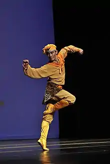 Shen Yun's dancers perform wearing intricate costumes, often accompanied by a variety of props.[8][6] Some costumes are intended to imitate the dress of various ethnicities, while others depict ancient Chinese court dancers, soldiers, or characters from classic stories.[8] Props include colorful handkerchiefs, drums,[8] fans, chopsticks, or silk scarves.[30][36]