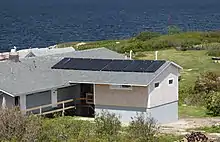SML maintains three diesel generators and two green energy grids to provide electrical power day and night. Green energy grids collect power from the sun with photovoltaic panels and from the wind with a 10 kW Bergy wind turbine.[17] Power collected is stored in sealed absorbed glass mat batteries. There are 52 batteries creating a storage capacity of 388 A·h at a nominal 48 V DC.[18] Stored power is inverted to AC electricity for distribution to the island's 14 buildings. Diesel generators provide backup power. Over the past eleven years, addition of photovoltaic power generation with battery storage, along with sustainability and energy efficiency efforts, has reduced fuel needs by 80%.[19]