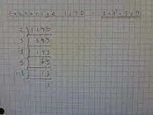 A common requirement is to reduce a number to its prime factors. This is used particularly in working with vulgar fractions. The dividend is successively divided by prime numbers, repeating where possible: