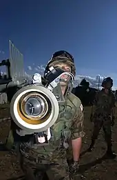 Shoulder-fired missile, shoulder-launched missile or man-portable missile, among other variants, are common slang-terms to describe high-caliber shoulder-mounted weapons systems – that is: weapons firing large heavy projectiles ("missiles"), typically using the backblast principle, which are small enough to be carried by a single person and fired while held on one's shoulder. The word "missile" in this context is used in its original broad sense of a heavy projectile, and encompasses all shells and rockets, guided or unguided (compare with guided missile). A more formal variant is simply shoulder-fired weapons system and the like.[1]