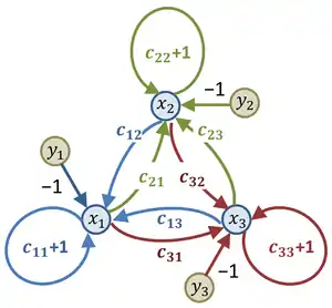 The signal-flow graph is now arranged by selecting one of these equations and addressing the node on the right-hand side. This is the node for which the node connects to itself with the branch of weight including a '+1', making a self-loop in the flow graph. The other terms in that equation connect this node first to the source in this equation and then to all the other branches incident on this node. Every equation is treated this way, and then each incident branch is joined to its respective emanating node. For example, the case of three variables is shown in the figure, and the first equation is:
