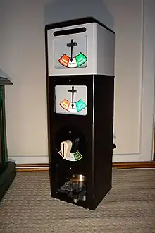 Telegraph block instruments of standard British Railways design. The bell is in the bottom part with the key for sounding the bell in the next signal box. Above that is the switch for indicating whether the section of line is clear (green), there is a train in that section (red) or the normal "line blocked" state (white).