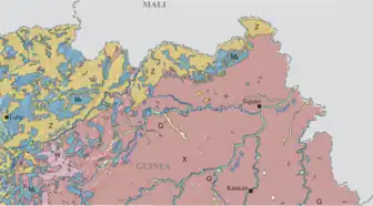 Placer gold is mined here.[4] North and northwest of Siguiri, and along the Tinkisso River, is the Bouré region. This region replaced Bambouk as a major gold producer in the 11th-12th centuries. Gold is also found along the Sankarani River.[5][6][7]