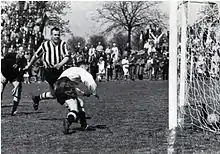 Pettersson scores one of his 298 goals in the colours of Landskrona BoIS, opponents are Motala AIF