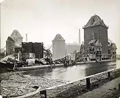 The former TNT factory's grounds are, as of 2015, empty, not having been built upon since the explosion.[3] The other part of the factory remained open after being repaired, until finally closing in 1961. This is also idle, as of 2015. A memorial was commissioned by Brunner Mond in the 1920s inside the entrance to the factory location; it also serves as a memorial for the First World War and Second World War.[12] For a time, the memorial was covered up due to the development of Royal Wharf in Silvertown, but by September 2016 it had been moved to a new location in the Royal Wharf development, closer to the site of the explosion.[13]