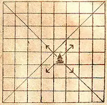 The sittuyin board consists of 64 squares, 8 rows and 8 columns, without alternating colors. The board has also two diagonal lines from corner to corner, which are known as sit-ke-myin (Burmese: စစ်ကဲမျဉ်း, general's lines).