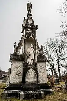 In 1894 under the leadership of Marcius D. Raymond, publisher of the local Tarrytown Argus newspaper, funds were raised to build a granite monument honoring the soldiers of the American Revolutionary War buried in the cemetery.[4][5]