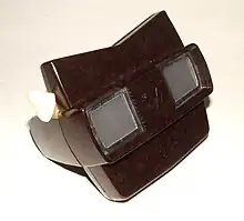 The practice of viewing stereoscopic film-based transparencies through a small magnifying viewer dates to at least as early as 1931, when Tru-Vue began to market black-and-white 35 mm filmstrips that were fed through a handheld viewer made of Bakelite.