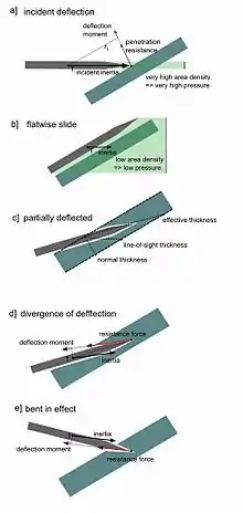 The final effect is that of deflection, deforming and ricochet of a projectile. When it hits a plate under a steep angle, its path might be curved, causing it to move through more armour – or it might bounce off entirely. Also it can be bent, reducing its penetration. Shaped charge warheads may fail to penetrate or even detonate when striking armour at a highly oblique angle. However, these desired effects are critically dependent on the precise armour materials used in relation to the characteristics of the projectile hitting it: sloping might even lead to better penetration.