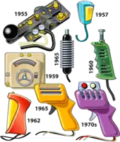 The early rail-car tracks used telegraph keys, model-train rheostats and other improvised means to control car speed. The first commercial race sets (1957) used handheld controllers with a thumb-button; like the telegraph key, these were either on or off, requiring the driver to "blip" the throttle for intermediate speeds. Later versions had an intermediate speed, and one late version used a buzzer mechanism to provide full-range speed control.