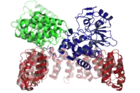 The human protein phosphatase 2A (PP2A) heterotrimeric complex, shown with the regulatory subunit A (red), regulatory subunit B56 (green), and catalytic subunit (dark blue).[12] The overlap between the STag and B56 binding sites on the A subunit is clear.