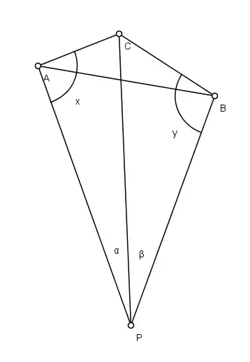 Denoting the (unknown) angles ∠CAP as x and ∠CBP as y gives: