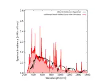 The unfiltered spectral output of a metal halide lamp. Typically an optical filter would be used to achieve a closer spectral match to AM1.5G.[38]